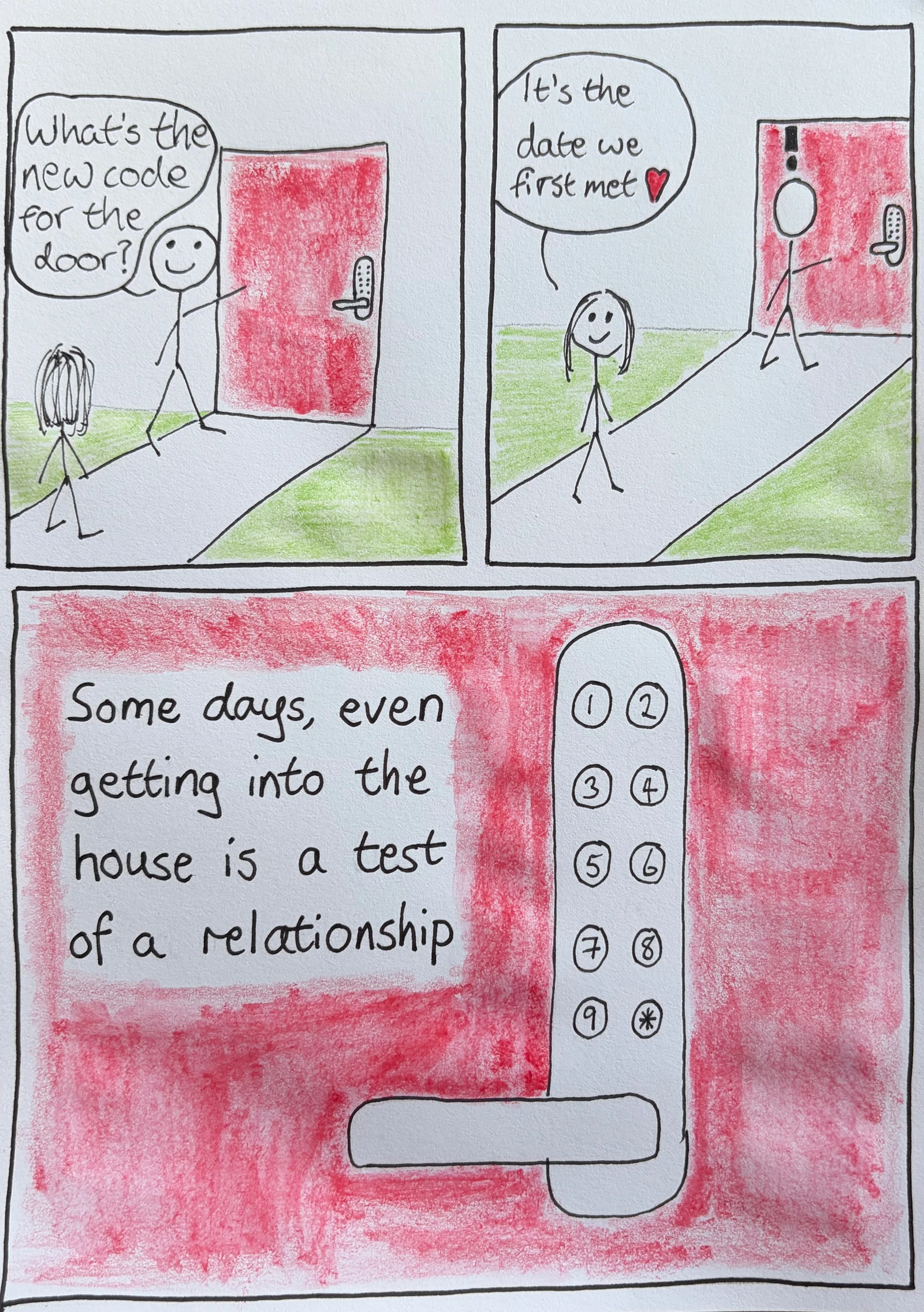 Relationship Tests March 2026 Notes Relationship tests come in all shapes and sizes. After a few days of this test, it should hopefully become second nature. Providing, that is, you remember why the code is that number. Good luck! Contact me about this comic